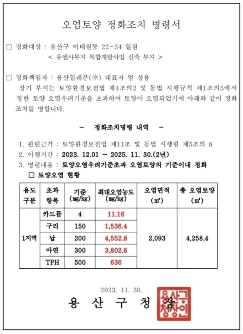 ▲용산구가 용산일레븐 측에 내린 이태원동 22의 34 오염토양 정화조치 명령서. (출처=뉴스핌) |
