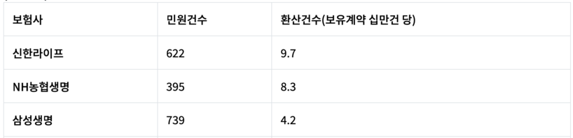 ▲ 2024년 상반기 생명보험사 판매 관련 민원건수 및 환산건수(단위: 건). (자료=생명보험협회 소비자포털/소비자주권시민회의 제공) |