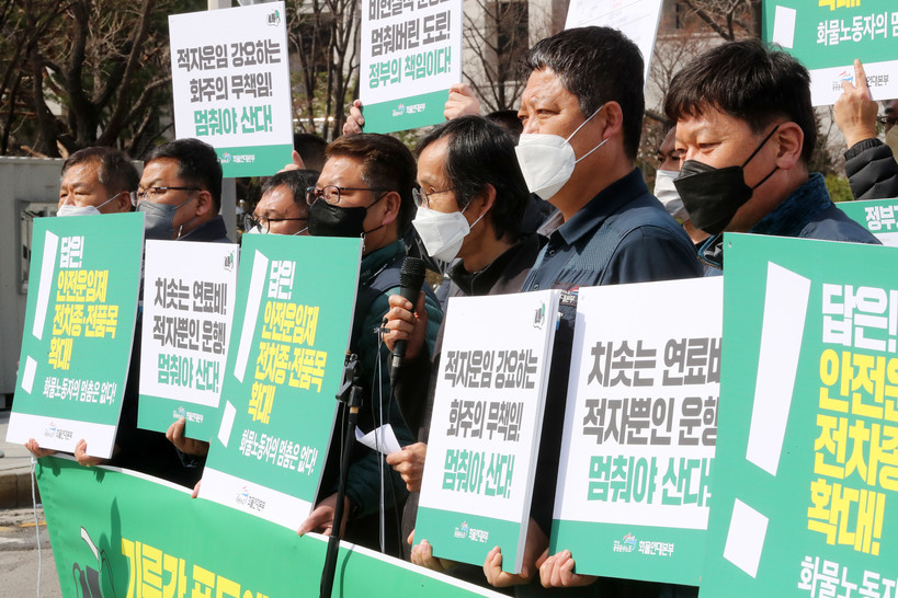 또 “문제는 안전운임제가 적용되는 품목은 화물차 41만대 중 2만6000대에 불과한 컨테이너·BCT 품목에만 적용된다는 점”이라며 “절대다수의 화물노동자는 유가폭등에 따른 피해를 고스란히 감당할 수밖에 없으므로 안전운임제 일몰제 폐지, 전차종·전품목 확대와 유가 인상에 따른 운임 인상이 필요하다”고 강조했다.