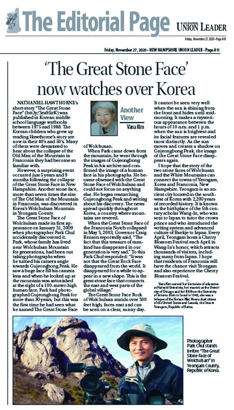 | ▲ 2020년 11월, 뉴햄프셔주 UNION Leader 일간지에 김반아 박사의 기고문을 통하여 ‘큰바위얼굴은 이제 코리아를 지키고 있다’라는 제목으로 소개되었다. |