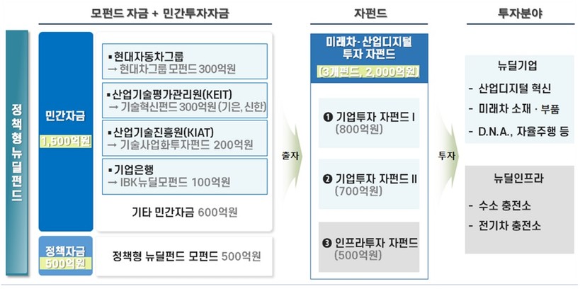 구체적으로 정책형 뉴딜펀드 모펀드 500억원, 업무협약 기관 900억원, 기타 민간자금 600억원 등이 조성된다. 이 가운데 현대차그룹이 300억원, KEIT 300억원, KIAT 200억원, 기업은행 100억원 등이다.