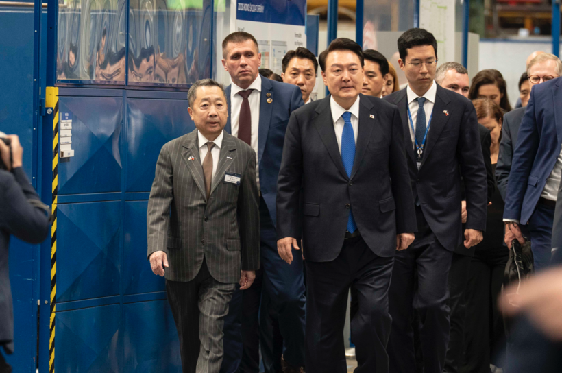▲ 20일(현지 시각) 두산에너빌리티의 자회사 두산스코다파워(체코 플젠)에서 진행된 ‘한국·체코 원전 전주기 협력 협약식’에서 윤석열 대통령(앞줄 오른쪽)이 박정원 두산그룹 회장(앞줄 왼쪽)의 안내를 받아 입장하고 있다. (사진=두산그룹 제공)