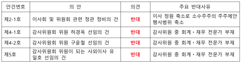◇ CGCG "이사 정원 축소 정관변경, 소수주주의 이사 추천권 제한하고 경영참여 과도하게 방어" 반대 권고