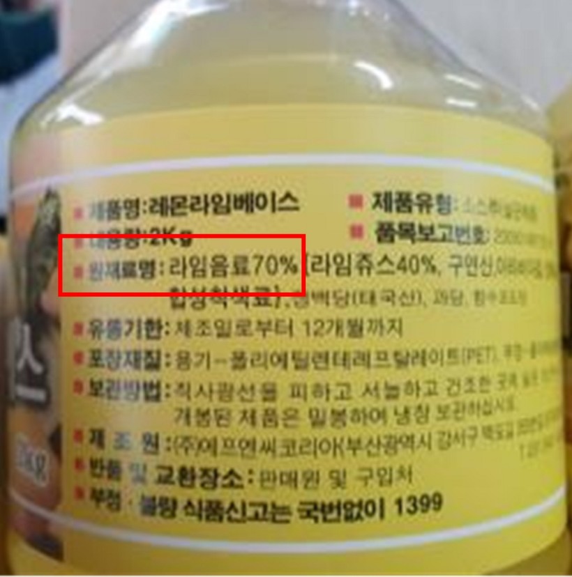해당 업체는 라임주스 함량 54%를 70% 함유로 표시하는 등 28개 제품을 거짓으로 표시해 519t, 약 55억원 상당을 판매한 것으로 드러났다.
