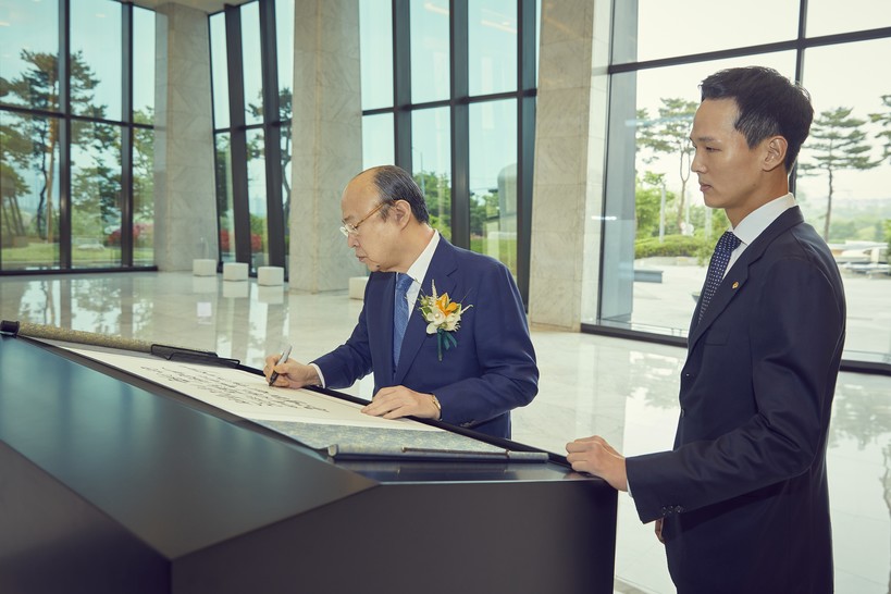 ▲ 한화그룹 김승연 회장이 한화금융계열사 임직원을 격려하는 방명록을 작성하고 있다.(사진=한화 제공) |