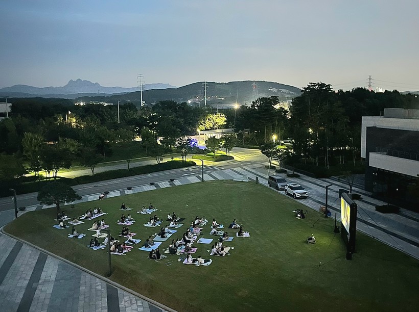 ▲ 삼성화재가 운영 중인 임직원 조직문화 프로그램 '힐링 북스테이'에 참여한 직원들이 야외 스크린으로 영화를 관람하고 있다. (사진 = 삼성화재 제공) |