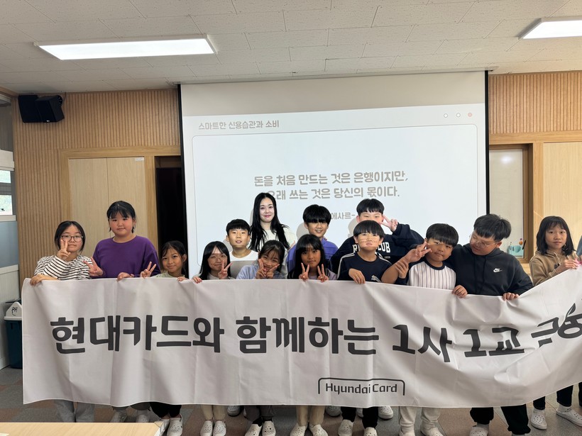 | ▲ 충남 공주 우성초등학교 학생들이 현대카드의 1사1교 금융교육을 수강한 후 기념사진을 촬영하고 있다. (사진=현대카드·현대커머셜 뉴스룸 제공) |
