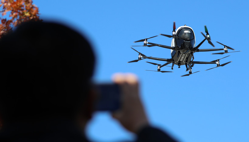 ▲도심항공교통 서울실증 행사에서 중국 이항사의 2인승급 드론택시용기체 이항216이 시범비행을 하고 있다.(사진=newsis) |