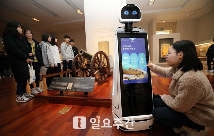 ▲한컴MDS는 지난해 국립중앙박물관과 국립나주박물관에서 국내 최초 지능형 문화정보 큐레이팅봇 '큐아이'서비스를 개시, 관람객들에게 전시품에 대한 안내 서비스를 제공한다. 사물인터넷(IoT)등 최신 기술을 적용한 안내 로봇이다. |