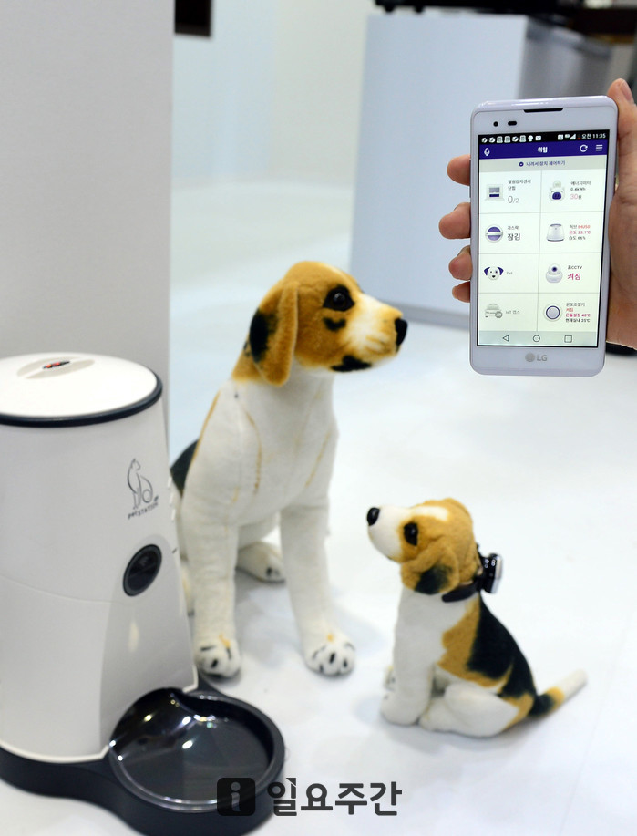 ▲사물인터넷 국제전시회에서 LG유플러스가 집 밖에서 스마트폰으로 강아지 밥을 줄수 있는 홈 IoT 솔루션을 선보이고 있는 모습. |