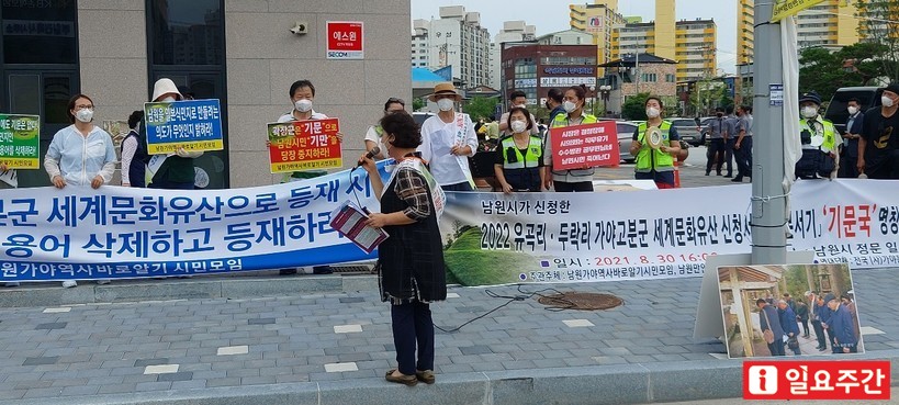 [일요주간 = 이태곤 기자] 지난 30일 오후 4시경 남원시민단체 남원운봉가야역사 바로알기시민모임에서 주관한 남원고분군 세계문화유산등재시 "기문삭제"하고 등재할 것을 촉구하는 항의 집회가 남원시청 정문앞에서 열렸다.