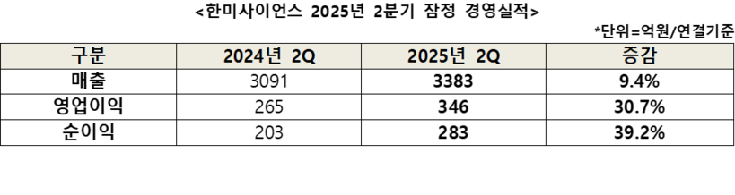 한미그룹에 따르면 한미사이언스는 2분기 연결 기준 매출 3383억 원, 영업이익 346억 원, 순이익 283억 원을 기록하며 전년 동기 대비 각각 9.4%, 30.7%, 39.2% 성장했다. 상반기 누적 매출은 6704억 원으로 전년 대비 6.5% 증가했으며, 영업이익과 순이익도 각각 617억 원, 528억 원을 달성했다.