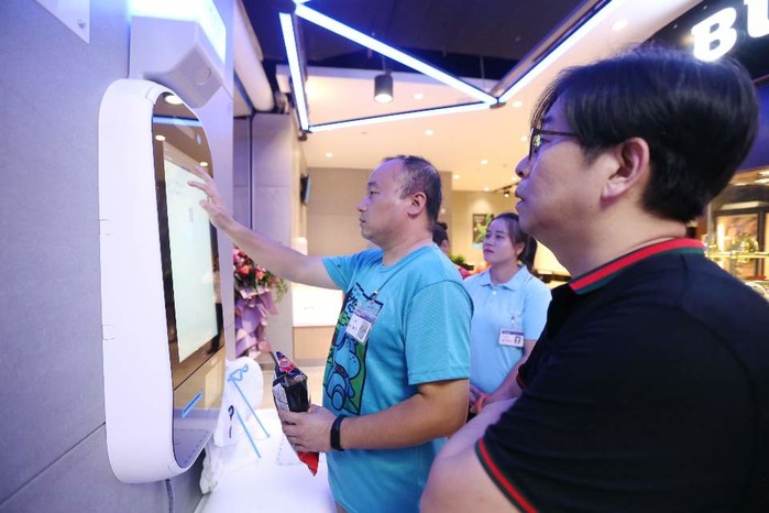 ▲중국 상거래업체 1위 알리바바그룹이 운영하는 신선식품 전문매장 허마셴셩(盒马鲜生)에서 직원들이 고객들을 대신해 스마트폰으로 상품 진열대 곳곳에 붙어있는 QR코드를 찍어 장을 보고 있는 모습.(사진= 농림축산식품부 제공) |