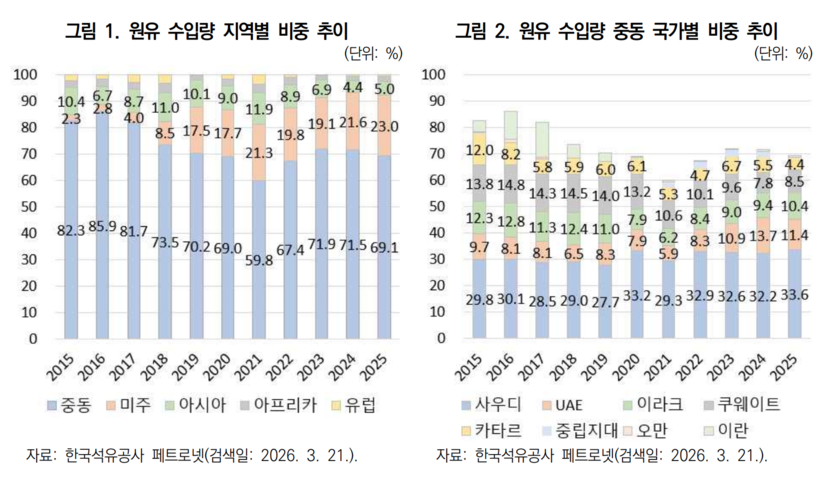 대외경제정책연구원은 “원유 수입이 특정 지역에 집중될 경우 지정학적 리스크에 취약해질 뿐 아니라 가격 협상력도 떨어질 수 있다”며 “실제로 중동 산유국들은 시장 상황에 따라 원유 판매 가격을 인상해 왔으며, 의존도가 높을수록 협상에서 불리해질 가능성이 크다”고 지적했다.