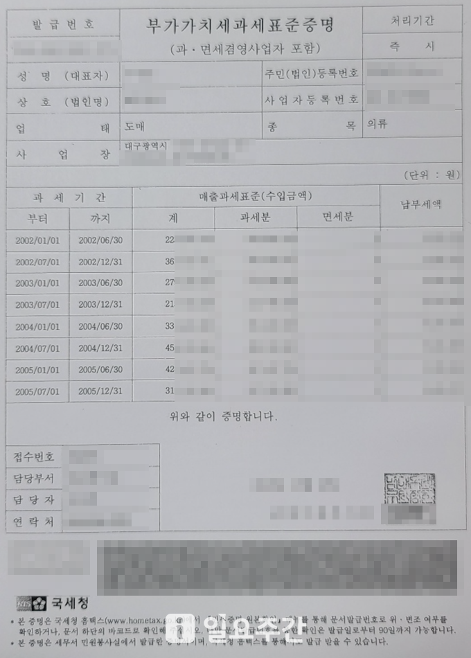 ▲ 사업자가 A대표 명의로 된 부가가치세과세표준증명원(개업일자부터 종료일까지) 내용을 검토한 바 상장회사 대표이사의 중대한 법적 문제가 포착됐다. 해당 문건은 본점과 OOO점에서 3개 브랜드 6개 매장을 운영하며 세무서에 신고한 자료이다.(자료=제보자 B씨 제공) |