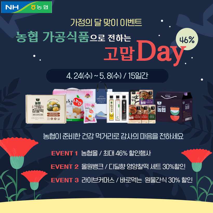 [일요주간 = 노현주 기자] 농협경제지주(농업경제대표이사 박서홍)가 5월 8일까지 가공식품 특별 할인전「농협 가공식품으로 전하는 고맙DAY」를 진행한다.