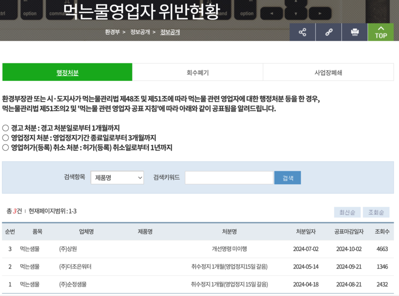 소비자주권시민회의는 또 “소비자들이 적발된 먹는 물 업체를 확인할 수 있는 유일한 곳은 환경부의 먹는 물 영업자 위반현황”이라며 환경부 먹는 물 영업자 위반현황에 따르면 환경부 먹는 물 영업위반자 공표 기간은 환경부장관 또는 시·도지사가 먹는물관리법 제48조 및 제51조에 따라 먹는 물 관련 영업자에 대한 행정처분 등을 한 경우 먹는물관리법 제51조의 2 및 ‘먹는 물 관련 영업자 공표 지침’에 따라 경고 처분(경고 처분일로부터 1개월까지), 영업정지 처분(영업정지 기간 종료일로부터 3개월까지), 영업허가·등록 취소 처분(허가·등록 취소일로부터 1년까지)과 같이 공표된다.