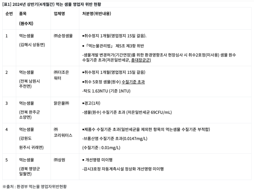 올해 상반기(4~7월) 생수 업체 적발 현황을 보면 경남 김해시 상동면에 소재한 ㈜순정샘물은 샘물개발 변경허가(기간 연장)를 위한 환경영향조사 현장심사 시 취수 2 호정(미사용)에서 샘물원수 수질기준 초과(저온일반세균, 총대장균군)로 '먹는물관리법' 제5조 제3항 위반에 따라 영업정지 15일에 갈음하는 취수정지 1개월 처분을 받았다.
