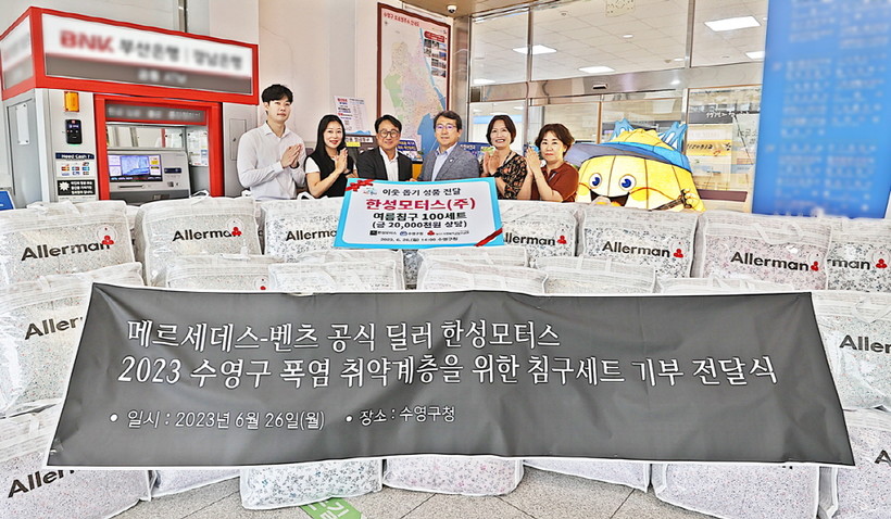 ▲한성모터스는 취약계층 위해 부산 수영구에 여름 침구세트를 기부했다.(사진=한성모터스 제공) |