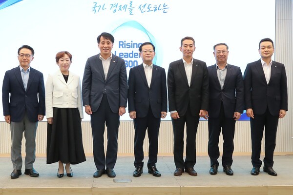 | ▲ (사진 왼쪽부터) 이호준 한국중견기업연합회 부회장, 민병주 한국산업기술진흥원 원장, 장영진 산업통상자원부 제1차관, 조병규 우리은행장, 김도훈 한국산업지능화협회 회장, 김윤태 대한무역투자진흥공사 부사장, 강신국 우리은행 기업투자금융부문장이 기념촬영을 하고 있다. (사진 = 우리은행 제공) |