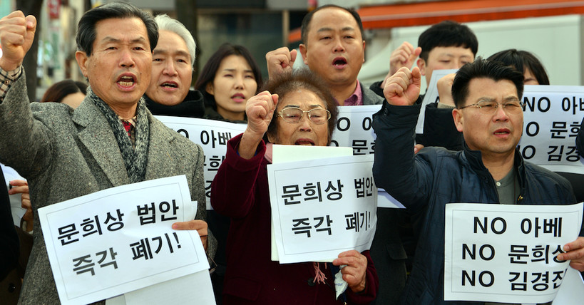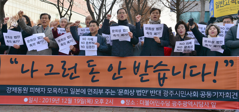 19일 광주시민단체협의회 및 근로정신대와 함께하는 시민모임 등 44개 단체는 더불어민주당 광주시당 앞에서 기자회견을 열고 "일본정부와 전범기업의 역사·법적 책임을 묻지 않은 채 면죄부를 주는 반인권적·반역사적 법안이다. 철회해야 한다"고 비판했다.