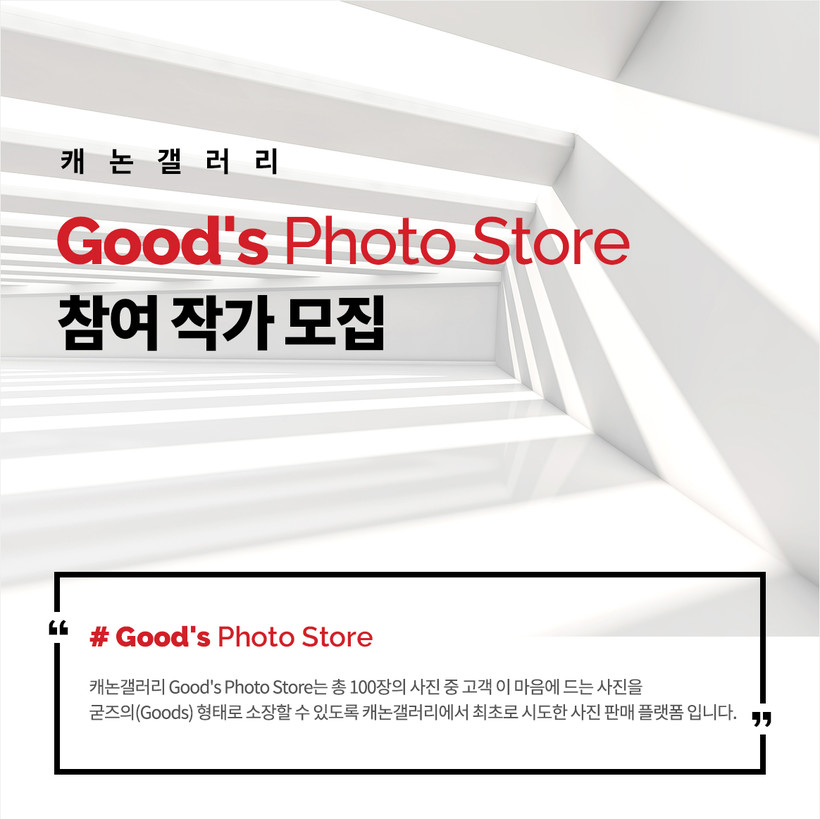 22일 굿스 포토스토어는 캐논갤러리 내 별도 공간에서 신진 사진 작가의 사진 총 100장을 전시하고, 굿즈 형태로 소장할 수 있도록 사진을 판매하는 플랫폼이다. 1장의 사진 당 1만원(A4 용지 사이즈 기준)으로 판매되며, 판매 수익은 참여 작가 및 캐논 갤러리에 전시하는 작가들를 위한 지원금으로 사용된다.
