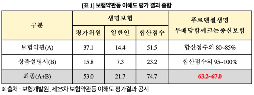 26일 소비자주권시민회의에 따르면 해당 상품은 푸르덴셜생명이 판매했던 ‘무배당함께크는종신보험(해지환급금일부지급형)’으로 보험개발원이 실시한 제25차 보험약관등 이해도 평가결과 생명보험에서 최저점을 기록했다. 총 21개의 생명보험(정기·종신보험) 평가점수 평균은 74.7점이고 이 중에서 해당 상품은 60점대 중반으로 최저점을 받았다.