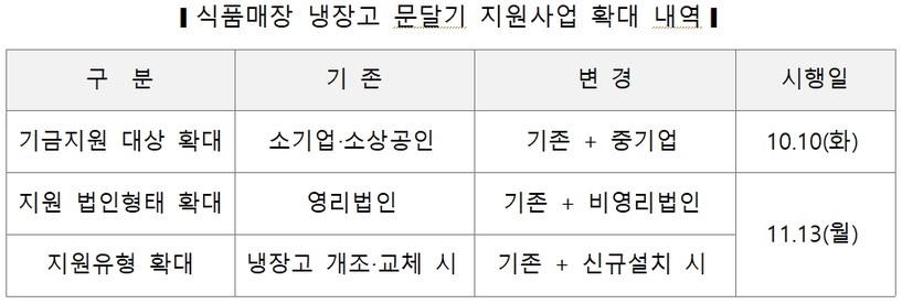 ▲ 식품매장 냉장고 문달기 지원사업 확대 내역 (표=한전) |