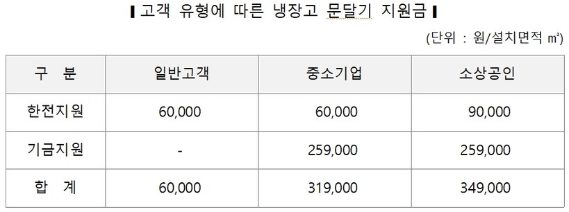 ▲ 고객 유형에 따른 냉장고 문달기 지원금 (표=한전) |