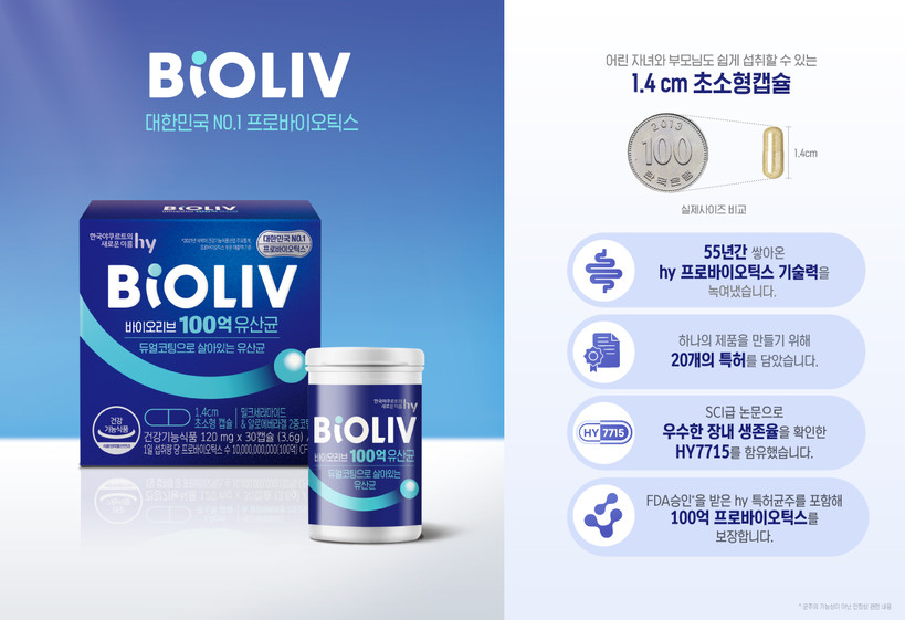 [일요주간 = 노현주 기자] 국내 프로바이오틱스 매출액 1위 기업 hy가 장기 배양과 특허 코팅 기술을 통해 장 끝까지 살아서 도달하는 100% 생(生) 유산균 ‘바이오리브 100억 유산균(이하 바이오리브)’을 선보인다. hy는 신제품 출시로 액상 중심의 프로바이오틱스 제품군을 분말, 캡슐로 확대하고 8000억 원 규모의 시장을 공략할 계획이다.