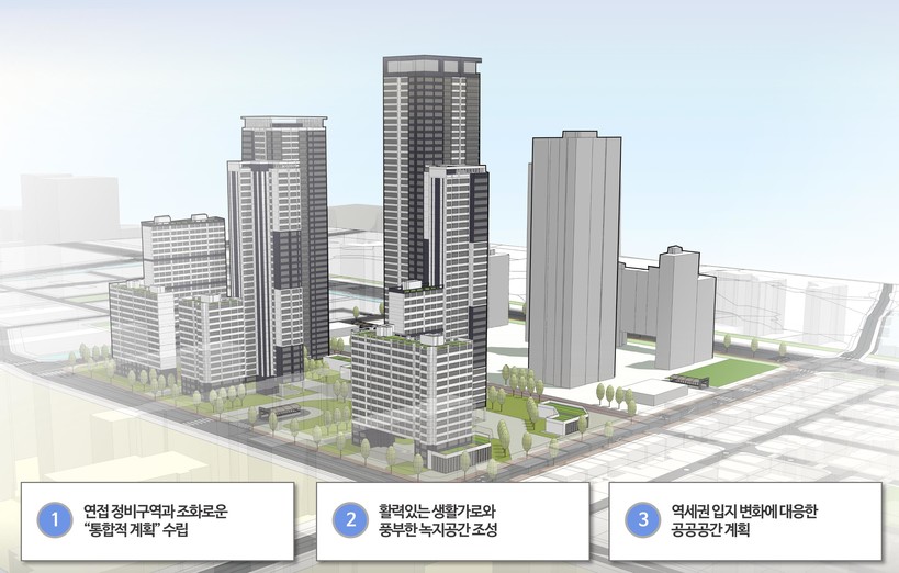 - 연접 정비구역과 ‘통합적 계획’을 통한 기반시설 정비 및 조화로운 스카이라인 형성