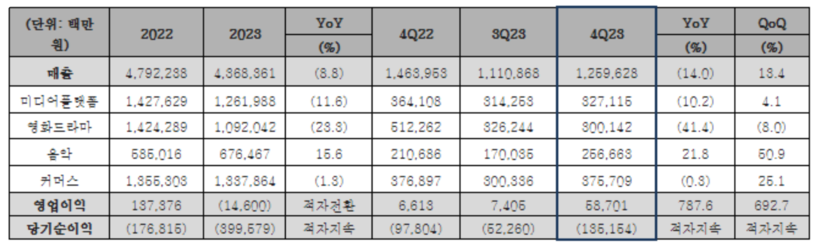 영화드라마 부문은 4분기 매출 3001억 원, 영업손실 53억 원을 각각 기록했다. 그러나 미국 작가ㆍ배우 파업으로 중단됐던 피프스시즌의 딜리버리가 재개되며 인기시리즈 <도쿄바이스(Tokyo Vice) 시즌2>, <스트라이프(Strife) 시즌1>을 비롯해 다수 영화와 다큐멘터리가 글로벌 OTT에 공급됐으며, 드라마 <무인도의 디바>와 <반짝이는 워터멜론>, 예능 <어쩌다 사장3>과 <출장 소통의 신-서진이네 편>등 킬러 콘텐츠들의 글로벌 판매가 지속 확대되며 3분기 대비 적자 규모가 축소됐다.