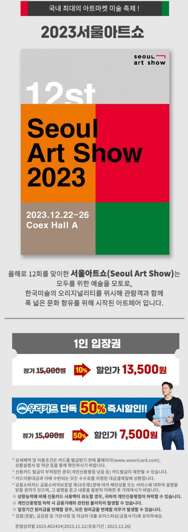 이 행사는 우리카드 고객(법인 및 기프트 카드 제외)에게 '12회 2023 서울 아트쇼' 일반 입장권을 50% 할인된 가격으로 제공한다. 정가는 1만 5000원이지만 이번 할인을 통해 7500원에 입장권을 사전 구매 또는 현장에서 구매할 수 있다.