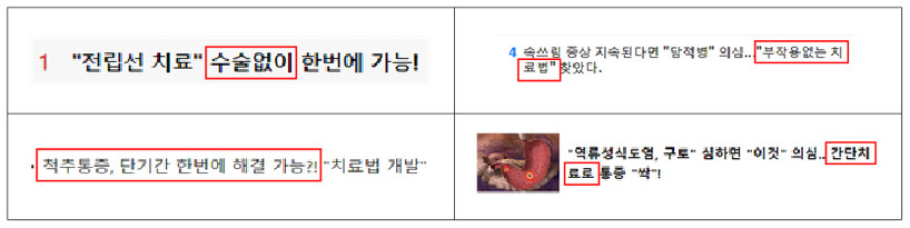 대표적인 부적절한 표현으로 ▲수술없이 치료 가능 ▲부작용 없는 치료법 발견 ▲ 00병(통증), 한번에 해결 가능 ▲간단치료로 해결 등 허위·과장적인 표현과 소비자를 오인 및 기만하는 표현이 지적됐다.