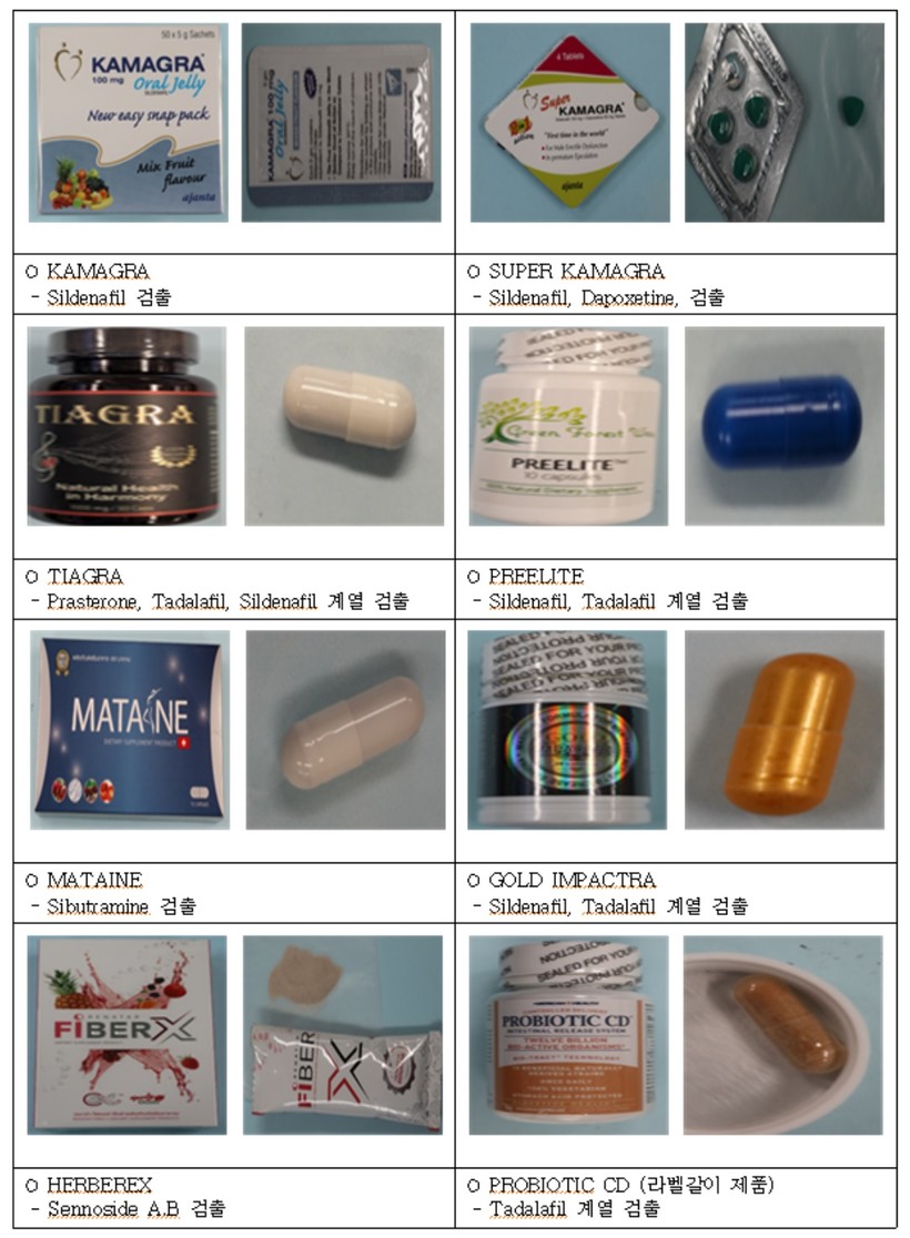 특히 이번에 적발된 제품들은 세관검사를 피하기 위해 발기부전 치료제인 태국산 카마그라(KAMAGRA) 제품을 은박지로 감싸고 과자를 동봉해 ‘비타민’, ‘스낵’ 등으로 신고하거나 겉포장 라벨을 건강기능식품처럼 위조·부착해 만들고 실제 내용물은 발기부전치료제, 근육강화 스테로이드제 등을 넣는 속칭 라벨갈이 수법으로 위해식품을 반입했다고 관세청은 설명했다.