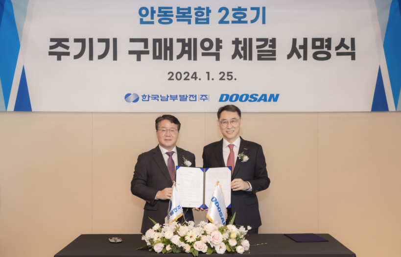 두산에너빌리티와 한국남부발전은 25일 서울 인터콘티넨탈 호텔에서 한국남부발전 이승우 사장, 두산에너빌리티 정연인 부회장 등 양사 관계자들이 참석한 가운데 안동복합발전소 2호기 공급계약을 체결했다.