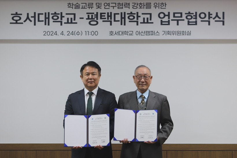 [일요주간 = 김성환 기자] 호서대학교(총장 강일구)는 평택대학교(총장 이동현)와 지난 24일 학술교류 및 연구협력 활성화를 위한 업무협약을 체결했다고 25일 밝혔다.