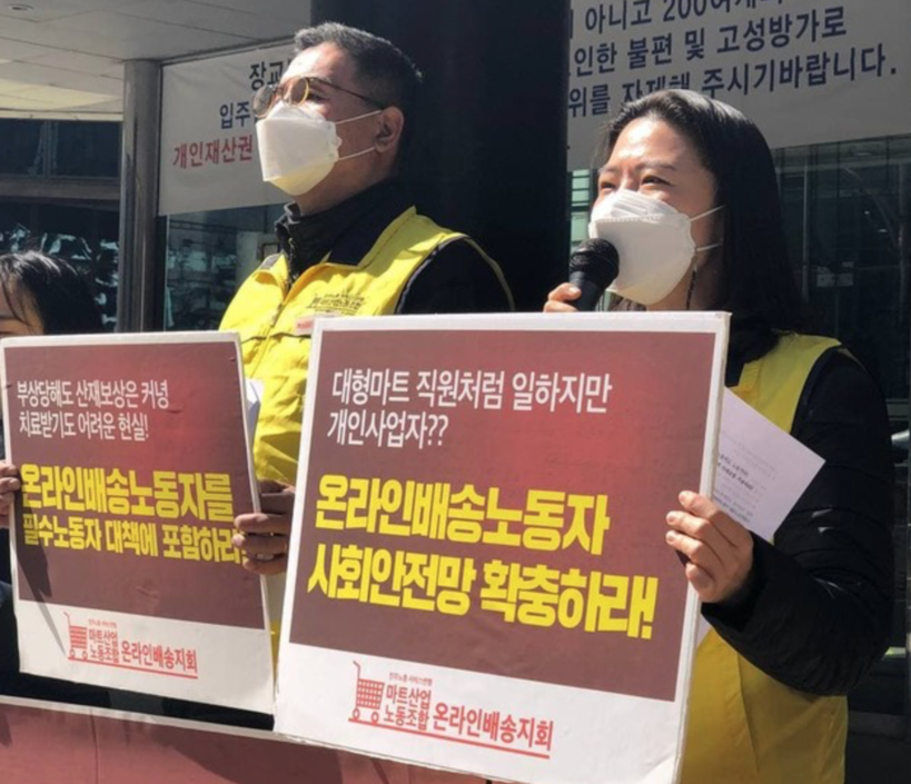 ▲ 민주노총 서비스연맹 마트산업노동조합 온라인배송지회는 온라인 배송노동자들이 자영업자로 분류돼 산재보험의 사각지대에 방치돼 있다며 배송현장에서 안전사고와 교통사고, 근골격계 질환 등으로 고통 받는 배송노동자들에 대한 정부에 대책 마련을 촉구하고 있다.(사진=마트산업노동조합 제공)