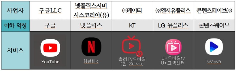 ▲ 조치 대상 5개 OTT 서비스 사업자. (사진=공정거래위원회) |
