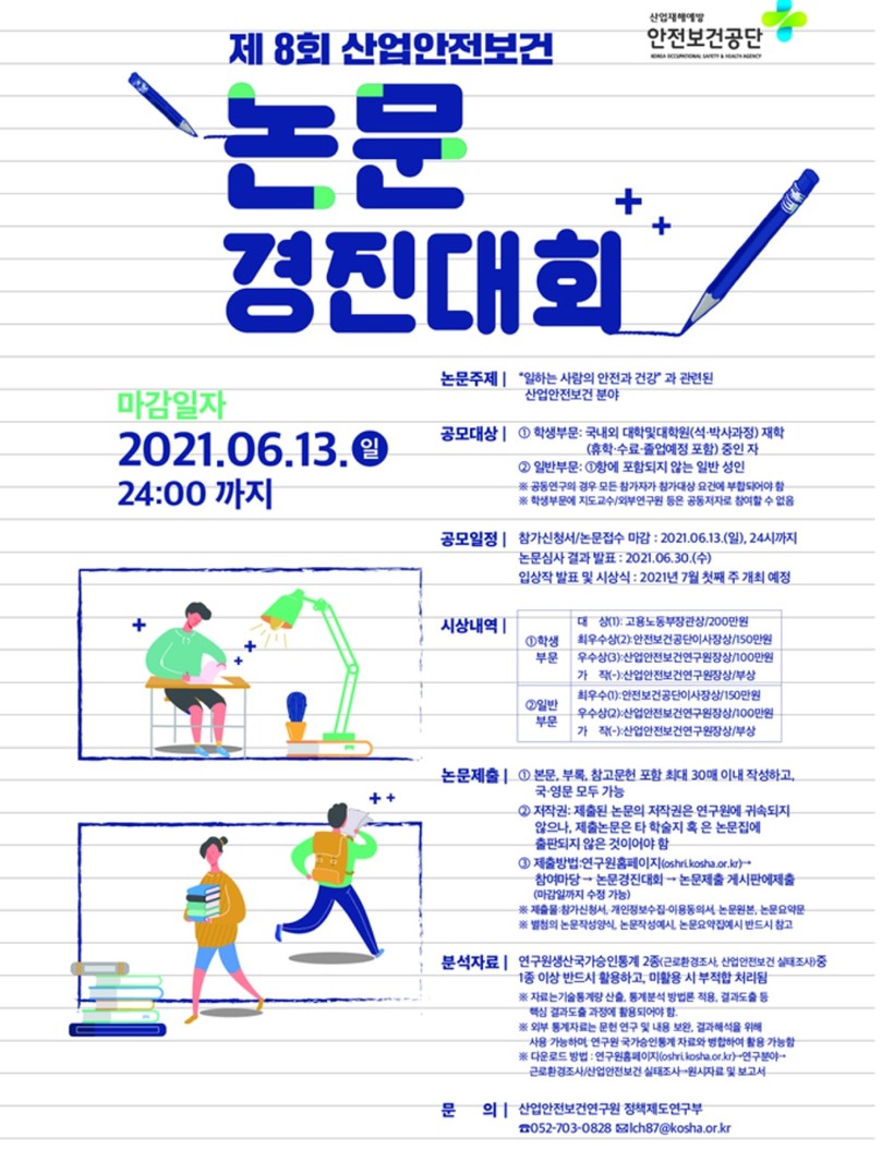 안전보건공단 산업안전보건연구원은 학생과 일반인을 대상으로 ‘제8회 산업안전보건 논문경진대회’를 개최한다고 22일 밝혔다.