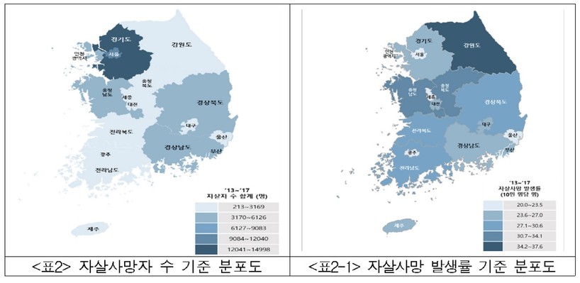 남성 자살사망자 수가 많은 지역은 제주도(74.7%), 강원도(74.3%), 전라북도(73.9%) 순이었다. 여성 자살사망자 수가 많은 지역은 대전시(34.1%), 서울시(33.0%), 대구시(31.5%) 등이었다.