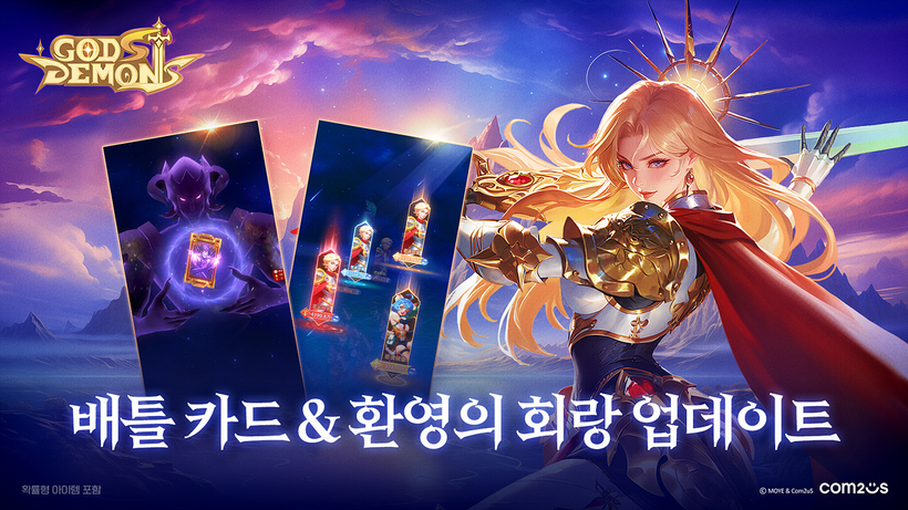 [일요주간 = 하수은 기자] 컴투스(대표 남재관)는 자사가 서비스하는 방치형 RPG ‘갓앤데몬’에 전략성을 강화한 신규 전투 시스템 ‘배틀 카드’와 맞춤형 던전 콘텐츠 ‘환영의 회랑’을 포함한 대규모 업데이트를 실시했다고 10일 밝혔다.