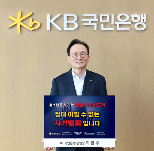 [일요주간 = 김완재 기자] KB국민은행 이환주 행장은 황영기 초록우산어린이재단 회장의 지목을 받아 청소년 불법 도박의 위험성을 알리는 ‘청소년 도박 근절 챌린지’에 참여, 청소년 보호에 대한 사회적 관심과 예방의 필요성을 강조했다.