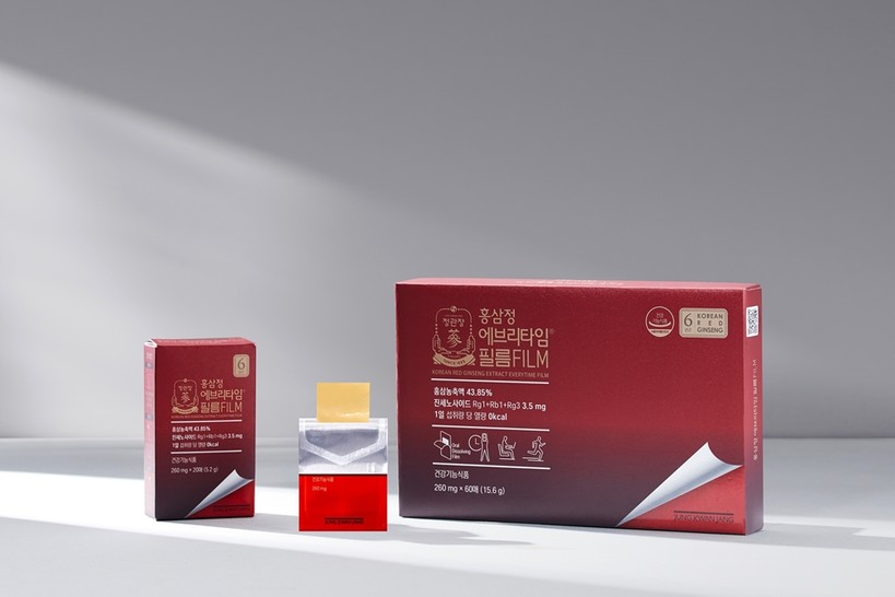 ‘에브리타임 필름’은 구강용해필름(ODF, Oral Dissolving Film)에 정관장의 기술로 홍삼농축액을 압축시킨 필름형 제품이다. 하루 한 장으로 홍삼의 기능성분을 섭취할 수 있도록 설계했으며 1일 섭취량당 열량 0㎉인 제로칼로리로 부담없이 즐길 수 있다.