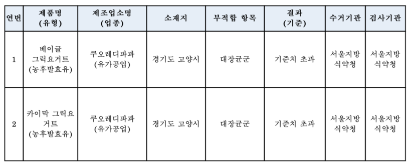 식약처는 "대장균군이 초과 검출된 제품은 GS25 편의점으로 납품되는 농후발효유(2건)로 해당 제품을 즉시 회수하고 폐기 조치했다"며 "해당 제품을 생산한 제조업체에 대해서는 관할 지자체가 행정처분 등의 조치 후 6개월 이내에 다시 점검해 개선 여부를 확인할 예정이다"고 밝혔다.
