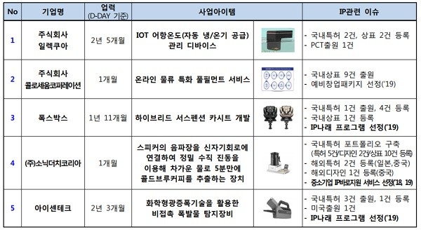 | ▲ ‘제1회 IP스타트업 로드데이’ 최종 발표 기업(5개) 현황. 특허청 제공 |