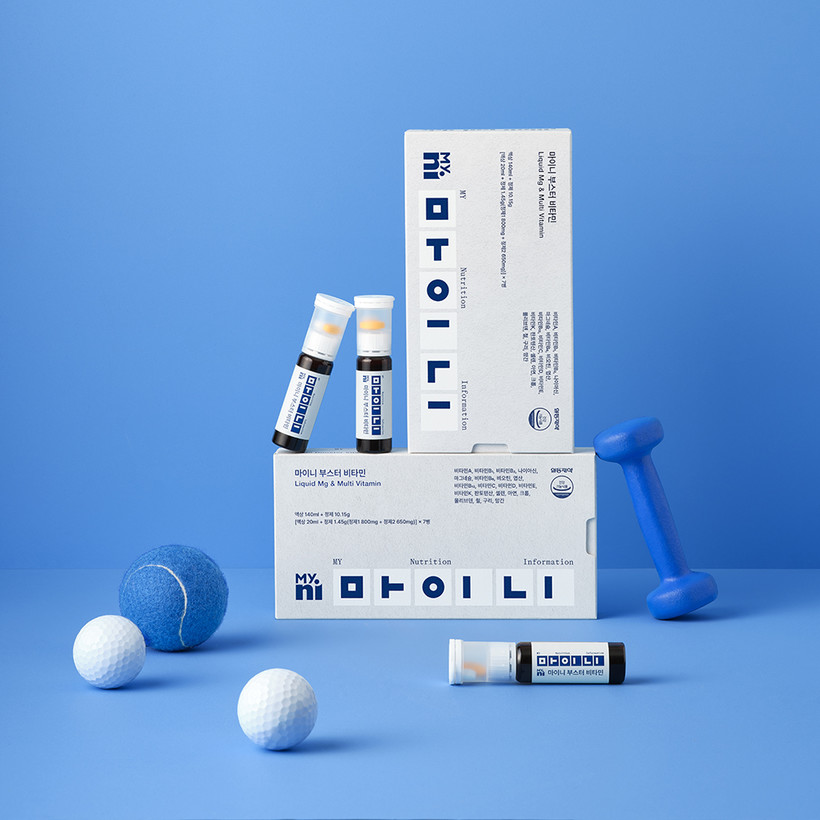마이니 부스터 비타민은 에너지 충전에 필요한 다양한 영양소에 초점을 맞춘 건강기능식품이다. 용기 속에 들어 있는 정제와 액상 마그네슘을 함께 섭취하는 2중 복합 제형이다.