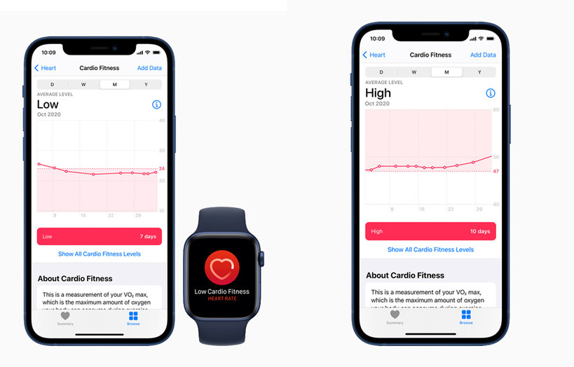 iOS 14.3과 워치OS 7.2는 애플 워치 사용자는 자신의 유산소 피트니스 레벨이 같은 연령대 및 같은 성별 내 사람들과 비교해 높음, 평균 이상, 평균 이하 또는 낮음으로 분류되는지를 검토할 수 있게 해준다.