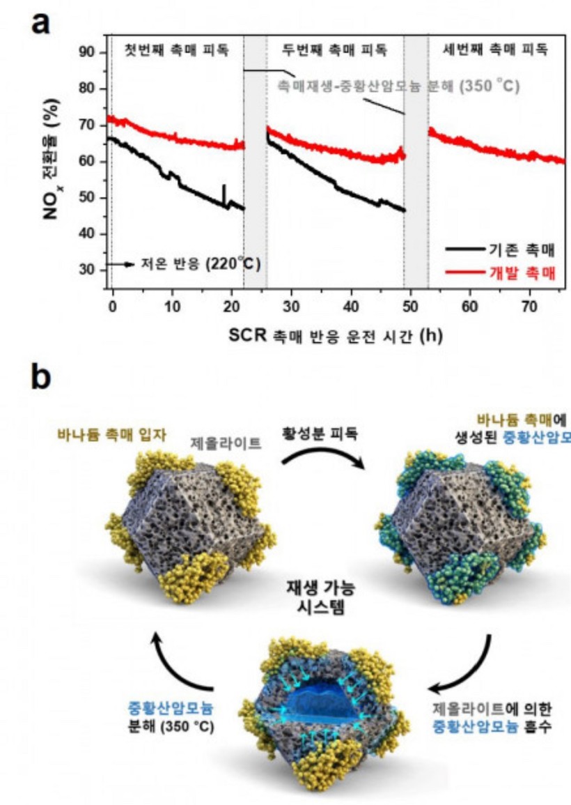 연구팀은 다공성 물질인 제올라이트를 기존 바나듐 촉매와 물리적으로 혼합할 때 촉매와 인접한 제올라이트가 촉매 표면에 침적되는 중황산암모늄을 선택적으로 흡수, 촉매 활성 저하를 억제한다는 것을 발견했다.