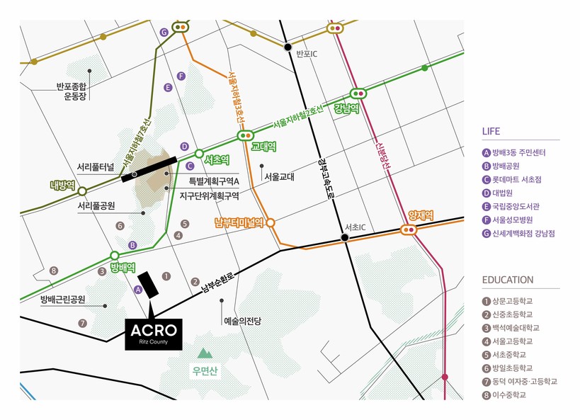 아크로 리츠카운티는 역세권 입지를 갖췄다. 단지 반경 400m 내 지하철 2호선 방배역이 위치해 서울 전역으로 이동이 편리하다. 또 남부순환로가 인접해 사당IC와 서초IC, 양재IC 등으로 진출입이 용이하며 강남순환도시고속도로와 경부고속도로 이용이 수월하다.